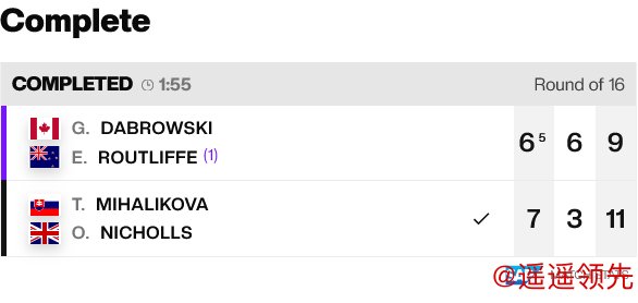 本球场最后结束的一场女双第二轮中,头号种子达布劳斯基/卢特利芙苦战1小时55分钟,打满三盘,以6-7(5)/6-3/[9]-[11]爆冷负于跨国组合米哈利科娃/尼科尔斯,无缘八强。