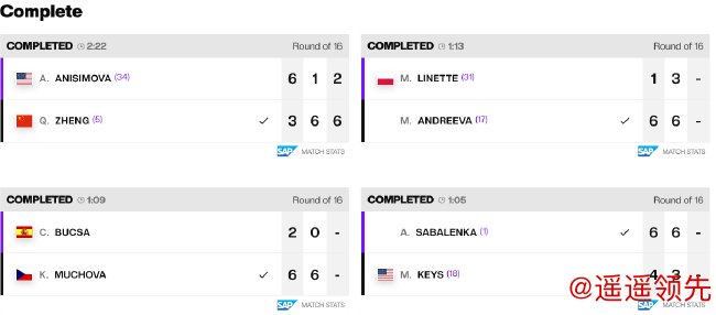 晚场最后结束的一场女单第四轮比赛中,5号种子郑钦文在先输一盘的情况下,连扳两盘,以3-6/6-1/6-2逆转34号种子阿尼西莫娃,最后一个打进女单八强。