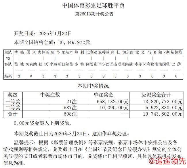 北京时间1月22日Kaiyun开云体育登录入口,足彩第26013期开奖结果揭晓。本期足彩头奖共开出21注,单注奖金658,132元;二等奖开出587注10,090元;任九开3121注3629元。本期14场销量为30,849,972元,任九总投注额为17,700,894元。