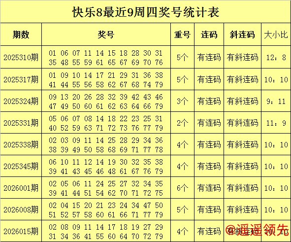 福彩快乐8第2026015期(上周四)奖号回顾:02 08 09 11 14 17 18 19 27 29 31 34 36 41 55 60 64 70 72 79,其中大小比为7:13,包含4个重号02、34、60、79,包含连码08 09、17 18 19。